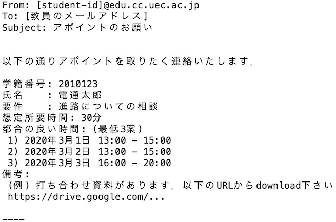 - 学内生は ([your-id]@edu.cc.uec.ac.jp or [your-id]@gl.cc.uec.ac.jp) のメールアドレスからメール送信のこと.